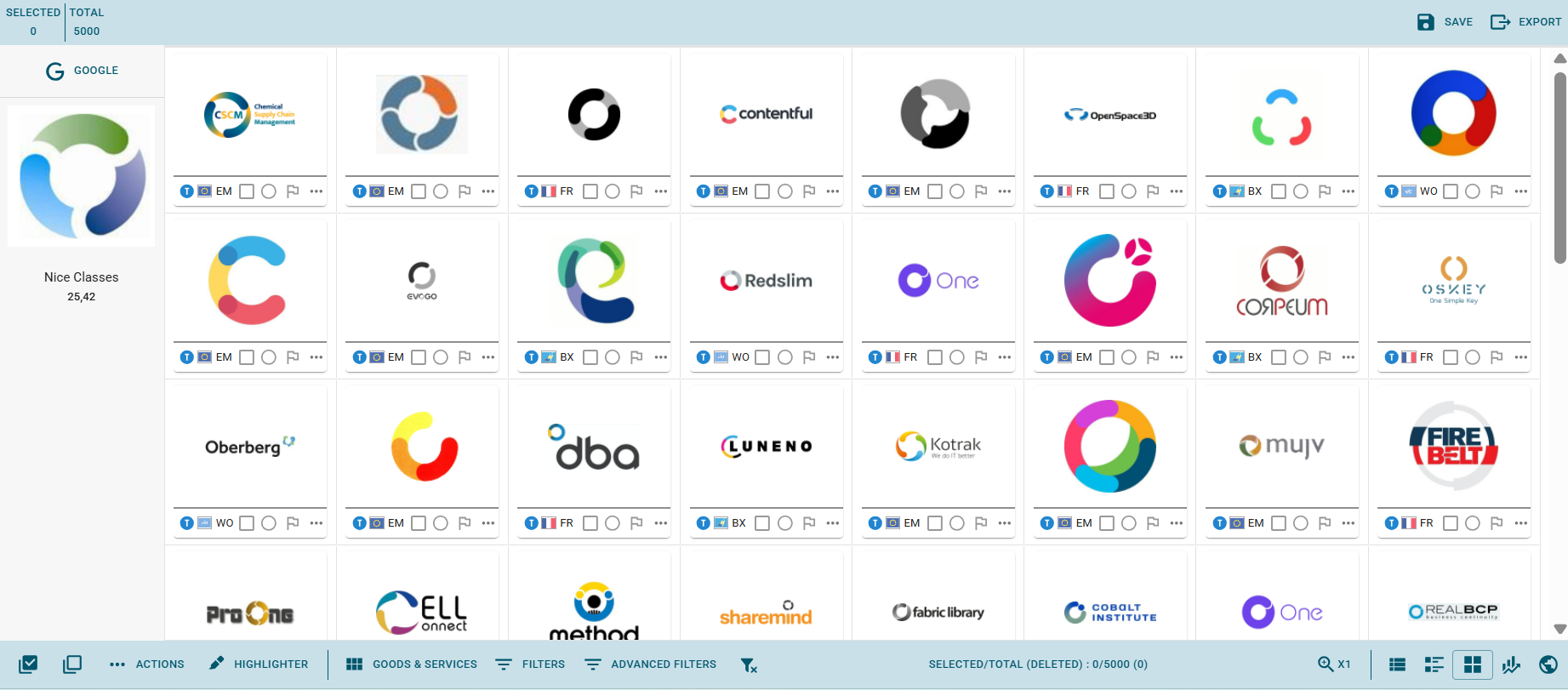 Performing several searches in one go on different databases (Trademarks, Pharmaceuticals, Companies and domains). Allows you to directly see if the candidates get exact hits.